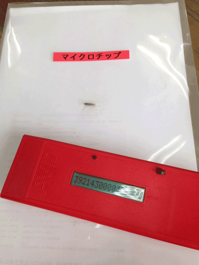 | ペットに装着するマイクロチップと読み取るリーダー |