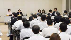小松島市議会では「通年議会」のメリットとして、市長による「専決処分」(議会を開くいとまがない時に議会にはからず市長が予算などを決済できる権限)ができないこと、一年間開会中なので災害時にはすぐ対応できること、デメリットとしては経費が増加することなどを説明。しかし、経費節減では議会側も費用弁償(一日出勤あたり支給される)を廃止するなど、努力していることも説明しました。
