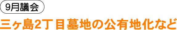 今まで湿地帯として貴重な緑地を残してほしいと運動があった三ヶ島2丁目の墓地予定地の公有地化です。この地域は里山保全地域に隣接しており、公有地化にむけて交渉を重ねる中で購入価格について合意され、1億3千5百万円で市が買い取ることになりました。