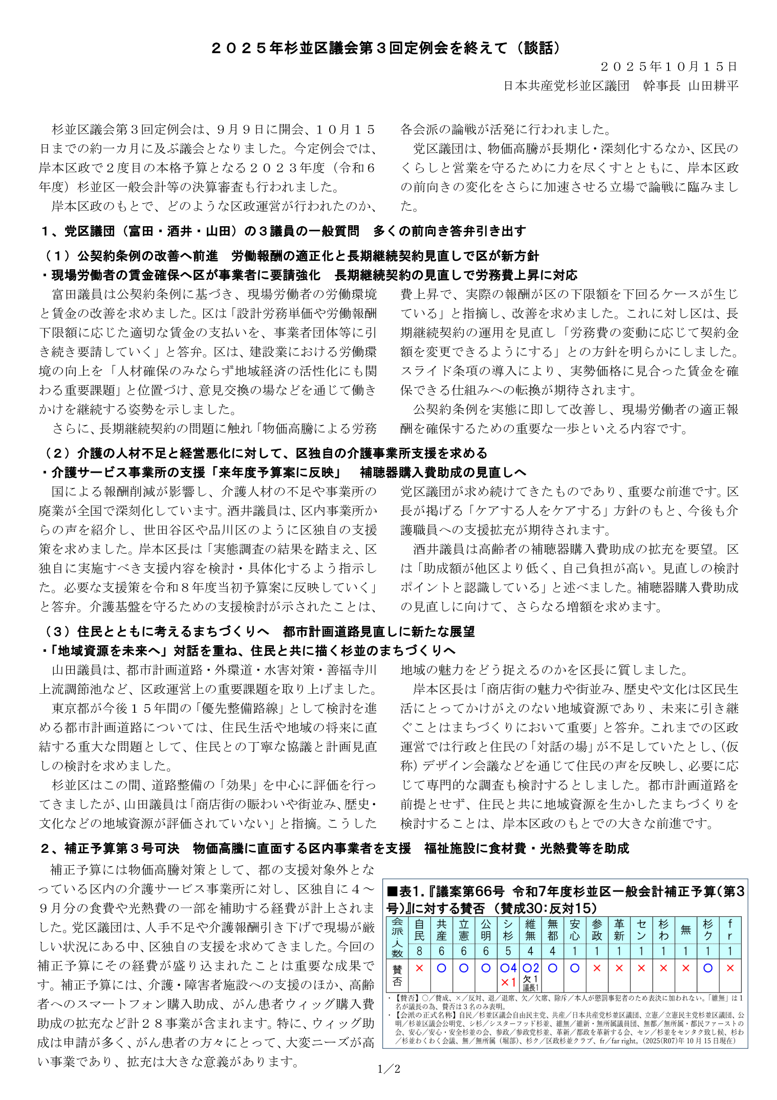 日本共産党杉並区議団(幹事長・山田耕平)は10月15日、以下の談話を発表しました。 2025年杉並区議会第3回定例会を終えて(談話) 2025年10月15日