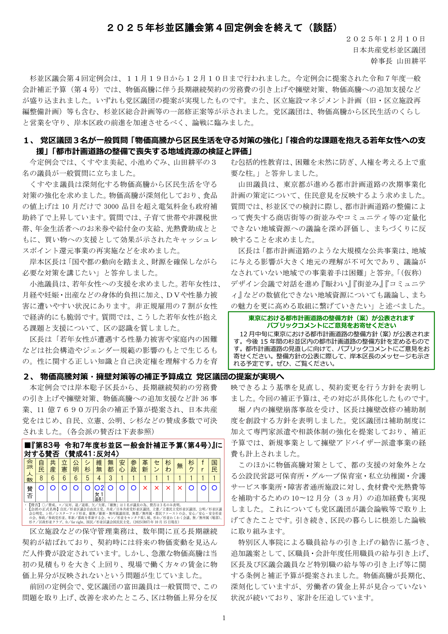 日本共産党杉並区議団 幹事長 山田耕平 杉並区議会第4回定例会は、11月19日から12月10日まで行われました。今定例会に提案された令和7年度一般会計補正予算(第4号)では、物価高騰に伴う長期継続契約の労務費の引き上げや擁壁対策、物価高騰への追加支援などが盛り込まれました。いずれも党区議団の提案が実現したものです。また、区立施設マネジメント計画(旧・区立施設再編整備計画)等も含む、杉並区総合計画等の一部修正案等が示されました。党区議団は、物価高騰から区民生活のくらしと営業を守り、岸本区政の前進を加速させるべく、論戦に臨みました。 1、 党区議団3名が一般質問「物価高騰から区民生活を守る対策の強化」「複合的な課題を抱える若年女性への支援」「都市計画道路の整備で喪失する地域資源の検証と評価」 今定例会では、くすやま美紀、小池めぐみ、山田耕平の3名の議員が一般質問に立ちました。 くすやま議員は深刻化する物価高騰から区民生活を守る対策の強化を求めました。物価高騰が深刻化しており、食品の値上げは10月だけで3000品目を超え電気料金も政府補助終了で上昇しています。質問では、子育て世帯や非課税世帯、年金生活者へのお米券や給付金の支給、光熱費助成とともに、買い物への支援として効果が示されたキャッシュレスポイント還元事業の再実施などを求めました。 岸本区長は「国や都の動向を踏まえ、財源を確保しながら必要な対策を講じたい」と答弁しました。 小池議員は、若年女性への支援を求めました。若年女性は、月経や妊娠・出産などの身体的負担に加え、DVや性暴力被害に遭いやすい状況にあります。非正規雇用の7割が女性で経済的にも脆弱です。質問では、こうした若年女性が抱える課題と支援について、区の認識を質しました。 区長は「若年女性が遭遇する性暴力被害や家庭内の困難などは社会構造やジェンダー規範の影響のもとで生じるもの。性に関する正しい知識と自己決定権を理解する力を育む包括的性教育は、困難を未然に防ぎ、人権を考える上で重要な柱。」と答弁しました。 山田議員は、東京都が進める都市計画道路の次期事業化計画の策定について、住民意見を反映するよう求めました。質問では、杉並区での検討に際し、都市計画道路の整備によって喪失する商店街等の街並みやコミュニティ等の定量化できない地域資源への議論を深め評価し、まちづくりに反映することを求めました。 区長は「都市計画道路のような大規模な公共事業は、地域に与える影響が大きく地元の理解が不可欠であり、議論がなされていない地域での事業着手は困難」と答弁。「(仮称)デザイン会議で対話を進め『賑わい』『街並み』『コミュニティ』などの数値化できない地域資源についても議論し、まちの魅力を更に高める取組に繋げていきたい」と述べました。 2、 物価高騰対策・擁壁対策等の補正予算成立 党区議団の提案が実現へ 本定例会では岸本聡子区長から、長期継続契約の労務費の引き上げや擁壁対策、物価高騰への追加支援など計36事業、11億7690万円余の補正予算が提案され、日本共産党をはじめ、自民、立憲、公明、シ杉などの賛成多数で可決されました。(各会派の賛否は下表参照) 区立施設などの保守管理業務は、数年間に亘る長期継続契約が結ばれており、契約時には将来の物価変動を見込んだ人件費が設定されています。しかし、急激な物価高騰は当初の見積もりを大きく上回り、現場で働く方々の賃金に物価上昇分が反映されないという問題が生じていました。 前回の定例会で、党区議団の富田議員は一般質問で、この問題を取り上げ、改善を求めたところ、区は物価上昇分を反映できるよう基準を見直し、契約変更を行う方針を表明しました。今回の補正予算は、その対応が具体化したものです。 堀ノ内の擁壁崩落事故を受け、区長は擁壁改修の補助制度を創設する方針を表明しました。党区議団は補助制度に加えて専門家派遣や相談体制の強化を提案しており、補正予算では、新規事業として擁壁アドバイザー派遣事業の経費も計上されました。 このほかに物価高騰対策として、都の支援の対象外となる公設民営認可保育所・グループ保育室・私立幼稚園・介護サービス事業所・障害者通所施設に対し、食材費や光熱費等を補助するための10〜12月分(3ヵ月)の追加経費も実現しました。これについても党区議団が議会論戦等で取り上げてきたことです。引き続き、区民の暮らしに根差した論戦に取り組みます。 特別区人事院による職員給与の引き上げの勧告に基づき、追加議案として、区職員・会計年度任用職員の給与引き上げ、区長及び区議会議員など特別職の給与等の引き上げ等に関する条例と補正予算が提案されました。物価高騰が長期化、深刻化していますが、労働者の賃金上昇が見合っていない状況が続いており、家計を圧迫しています。 こうした状況のもとで、職員等給与の引き上げは妥当なものであり、議案に