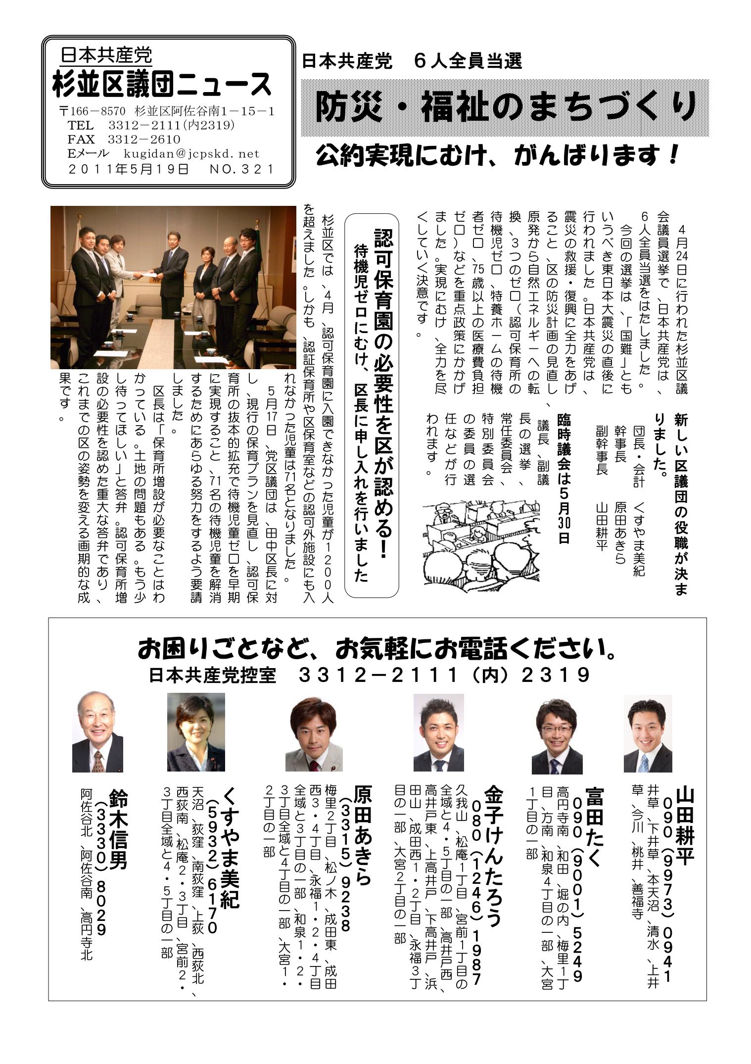 日本共産党杉並区議団ニュースNO.321(2011年区議選6人全員当選・東日本大震災救援活動) |