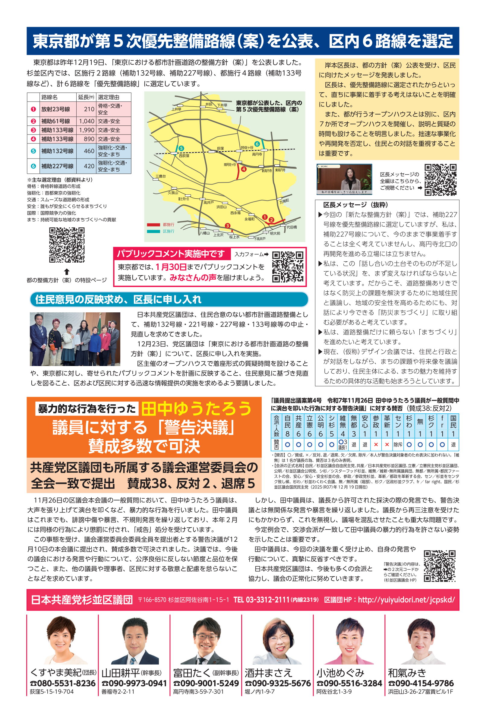 日本共産党杉並区議団ニュース№446を発行しました。杉並区議会・第4回定例会の報告を掲載しておりますので、ぜひご覧ください。 2026年 くらしと福祉支える区政 さらに前へ みなさんの声を力に 区民が主人公の杉並へ全力!新しい年を迎えました。 岸本区政のもと、くらしと福祉を守る施策が前進しています。 日本共産党杉並区議団が提案した家賃助成や転居費用助成が開始され、住まいの支援が拡充されました。 介護人材の確保・定着に向けた検討も進められ、物価高騰下で重要な対策となっています。 さらに、子どもの権利条例の制定や児童館の存続・新設が方針化され、子どもの成長を支える環境が強化されています。 パートナーシップ制度の登録も50組を超え、多様性を尊重する地域づくりが前進しています。 これらは区民の声と共産党区議団の粘り強い働きかけによる成果です。 物価高騰から区民のくらしと営業を守り、区民が主人公の区政をさらに進めるために、本年も全力を尽くします。 第4回区議会定例会 日本共産党区議団の一般質問▼物価高騰から区民生活を守る対策強化を(くすやま美紀議員) 物価高騰が深刻です。食品の値上げは10月だけで3000品目を超え、電気料金も政府補助終了で上昇しています。くすやま議員は、子育て世帯や非課税世帯、年金生活者へのお米券や給付金の支給、光熱費助成とともに、買い物への支援として効果が示されたキャッシュレスポイント還元事業の再実施などを求めました。 区長は「国や都の動向を踏まえ、財源を確保しながら必要な対策を講じたい」と答弁しました。 ▼複合的な課題を抱える若年女性に支援を(小池めぐみ議員) 若年女性は、月経や妊娠・出産などの身体的負担に加え、DVや性暴力被害に遭いやすい状況にあります。非正規雇用の7割が女性で経済的にも脆弱です。小池議員は、こうした若年女性が抱える課題と支援について区の認識を質しました。 区長は「望まない妊娠や性暴力、経済的困窮は社会構造が生む問題であり、正しい知識と自己決定権を育む包括的性教育は人権保障の重要な柱。若年女性の困難の予防に大きな効果があると考えている」と答弁しました。 ▼都市計画道路 地域資源の議論と評価を(山田耕平議員) 山田議員は、東京都の都市計画道路次期事業化計画について、住民意見を反映させるとともに、杉並区での検討に際し、商店街やコミュニティなど、数値化できない地域資源を評価し、まちづくりに生かすよう求めました。 区長は、「大規模事業には地元の理解が不可欠であり、議論がなされていない地域での事業着手は困難」と答弁。「(仮称)デザイン会議で対話を進め、『賑わい』『街並み』『コミュニティ』などについても議論し、まちの魅力を更に高める取組に繋げていきたい」と述べました。 物価高騰対策、擁壁の安全対策が前進 〜共産党区議団の提案実る〜昨年11月19日から12月10日まで開催された第4回杉並区議会定例会に提案された補正予算には、共産党区議団も求めてきた事業の経費が盛り込まれました。 ●擁壁アドバイザー派遣事業 新規事業として、擁壁アドバイザー派遣事業の経費が計上されました。9月30日に堀ノ内1丁目で発生した擁壁崩落事故を受け、岸本区長は擁壁改修の補助制度を創設する方針を表明していました。 党区議団は、第3回定例会の決算特別委員会で、補助制度に加えて専門家派遣や相談体制の強化を提案。その一部が実現しました。 ➡擁壁アドバイザー派遣事業の詳細はコチラから(区HP) ●福祉施設への物価高騰対策継続 物価高騰対策として、都の支援の対象外となる公設民営認可保育所・グループ保育室・私立幼稚園・介護サービス事業所・障害者通所施設に対し、食材費や光熱費等を補助するための10〜12月分(3か月)の追加経費が計上されました。長期化する物価高騰のもと、党区議団は支援の継続を求めていました。 ●長期継続契約の労働者の賃金引き上げへ 区立施設などの保守管理業務は、数年間にわたる長期継続契約が結ばれており、契約時には将来の物価変動を見込んだ人件費が設定されています。しかし、この間の急激な物価高騰は当初の見積もりを大きく上回り、現場で働く方々の賃金に物価上昇分が反映されないという問題が生じていました。 党区議団は、前定例会でこの問題を取り上げ是正を要求。区は物価上昇分を反映できるよう基準を見直し、契約変更を行う方針を表明。今回の補正予算では、その対応が具体化され、計17事業、4677万2千円が計上されました。これにより、現場労働者の賃金が引き上げられます。 東京都が第5次優先整備路線(案)を公表、区内6路線を選定東京都は昨年12月19日、「東京における都市計画道路の整備方針(案)」を公表しました。杉並区内では、区施行2路線(補助132号線、補助227号線)、都施行4路線(補助133号線など)、計6路線を「優先整備路線」に選定しています。 ●都の方針(案)について岸本区長がメッセージを公表 岸本区長は、都の方針