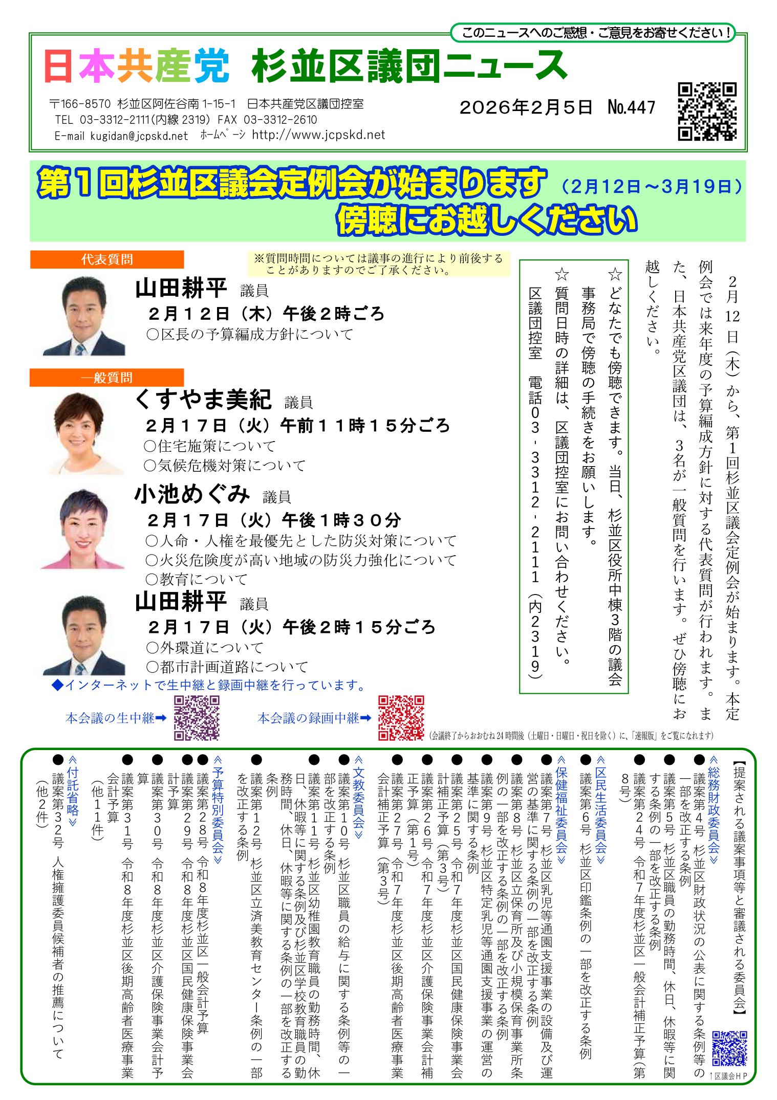 日本共産党杉並区議団ニュースNO.447(杉並区議会第1回定例会のおしらせ_2026年2月号) |